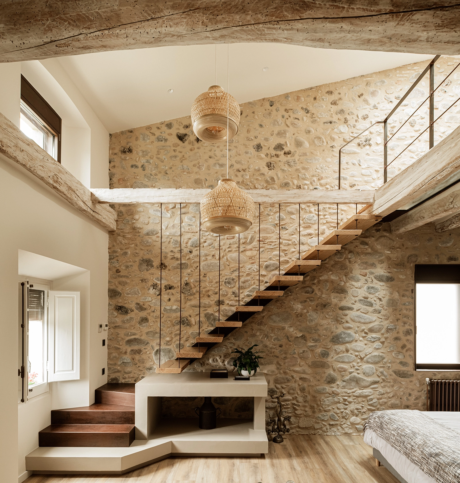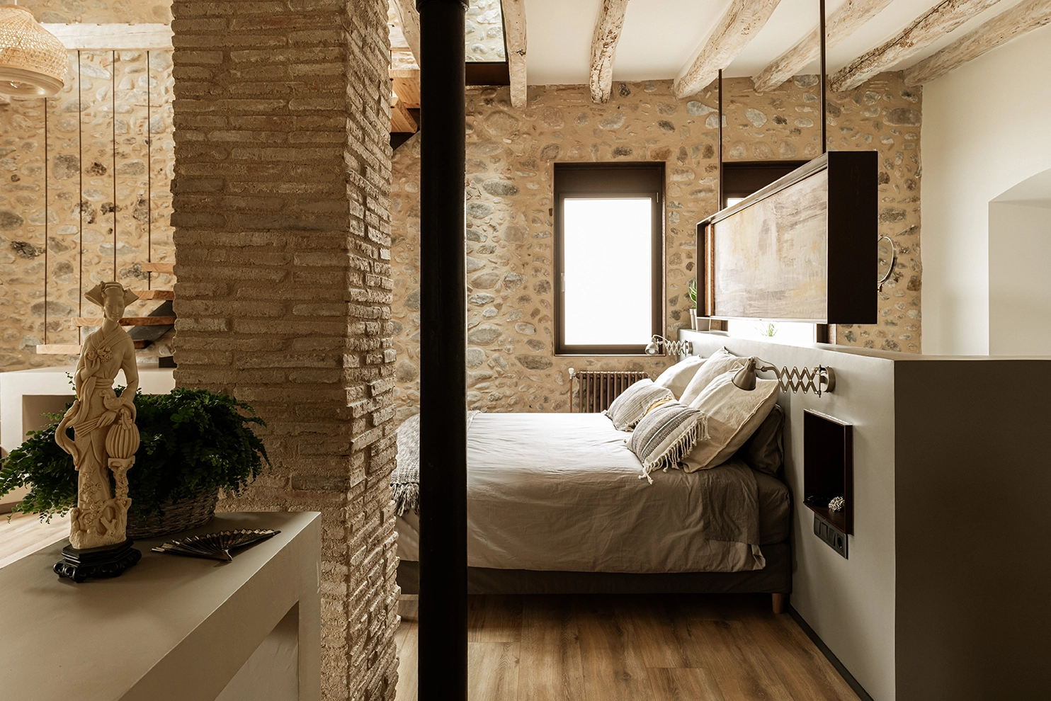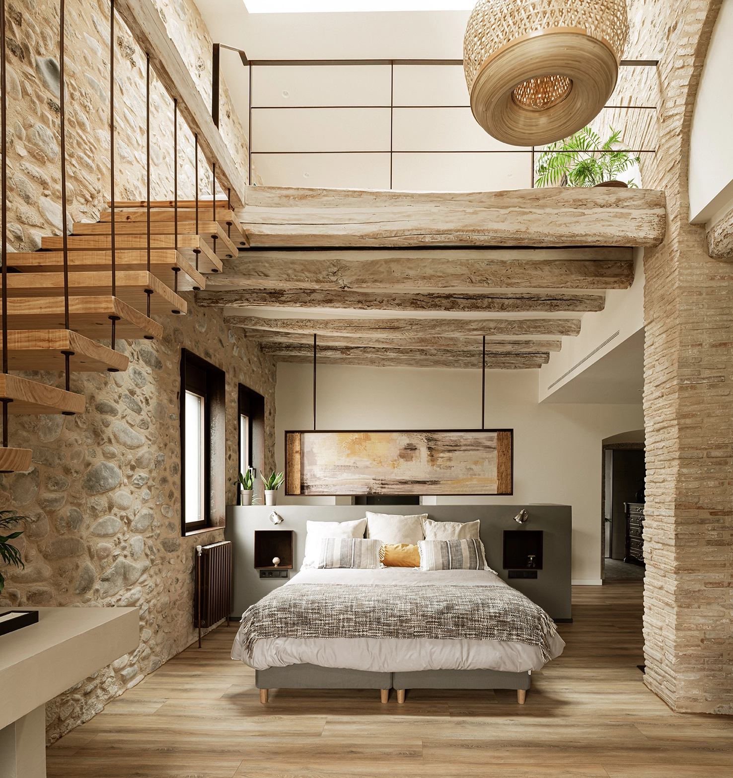 El resultado es una suite que conserva muros de piedra vista y vigas de madera blanqueadas, conviviendo con pavimentos de microcemento, cerámica de pequeño formato en el baño y detalles de acero corten. El dormitorio principal se abre como un espacio cálido y sereno, presidido por un cabecero integrado y acompañado por una escalera ligera que conduce a un altillo de relax. La doble altura y la luz natural de un lucernario refuerzan la amplitud y la conexión visual de los dos niveles.