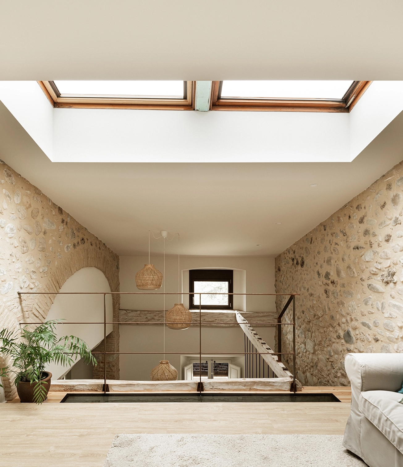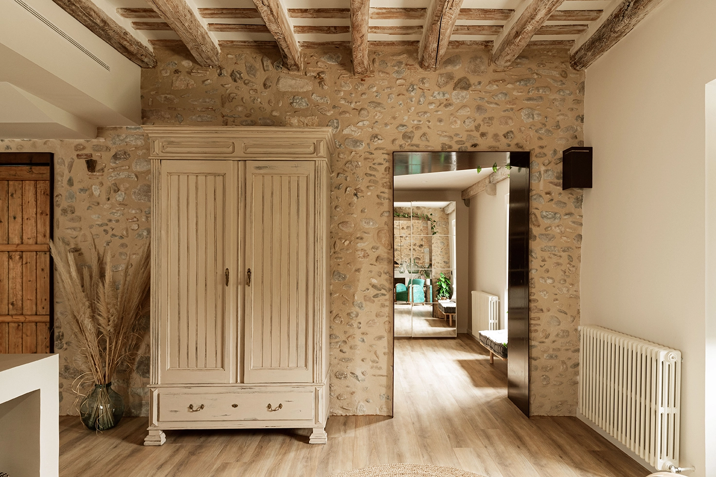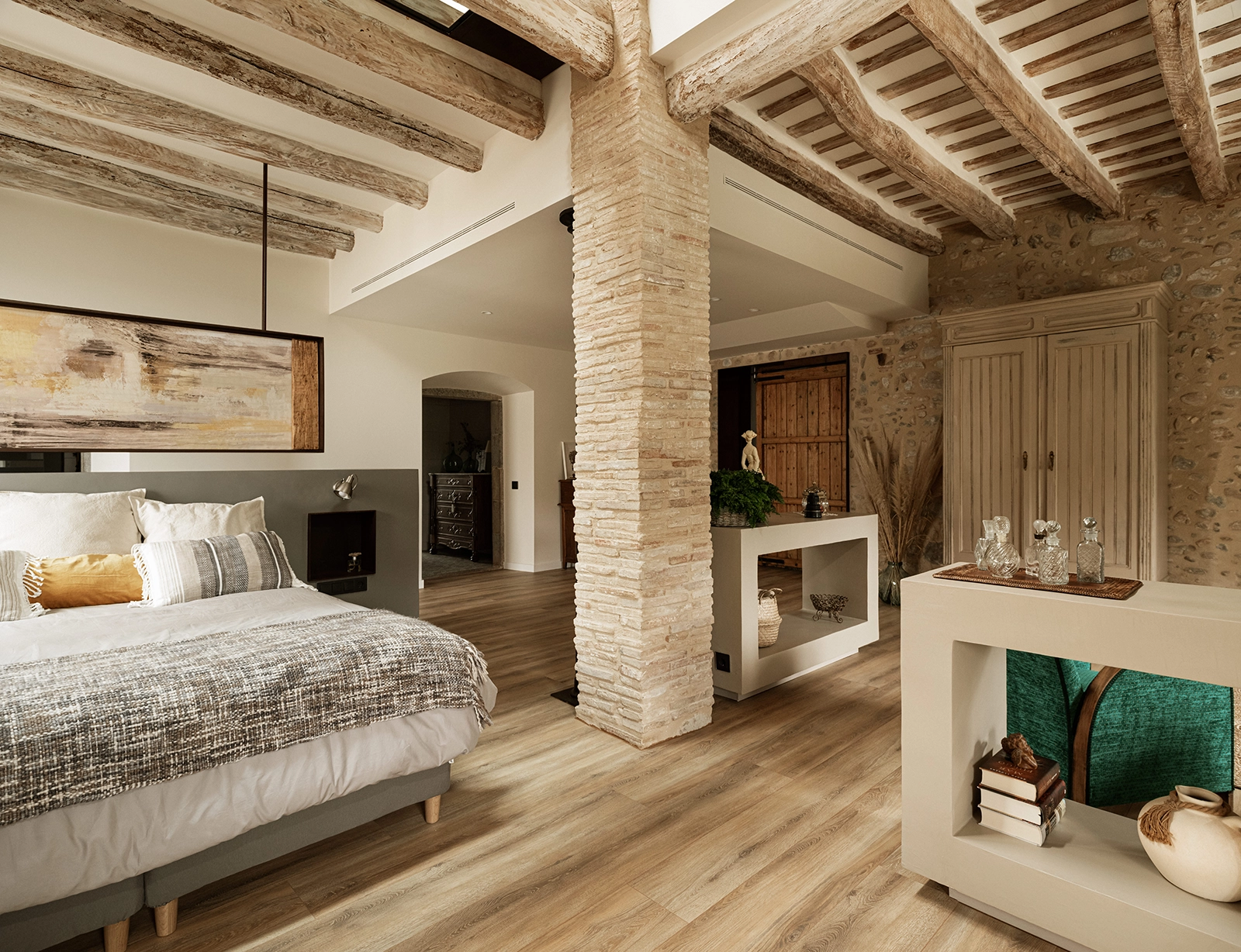 La intervención no compite con la masía, sino que dialoga con su historia. Cada material busca poner en valor lo existente y complementarlo con soluciones actuales. Así, donde antes había cinco estancias pequeñas y oscuras, hoy existe una master suite diáfana, llena de luz, que conserva el carácter rural y aporta confort contemporáneo. Un refugio que refleja la esencia de la arquitectura mediterránea: arraigo, sencillez y belleza atemporal.
