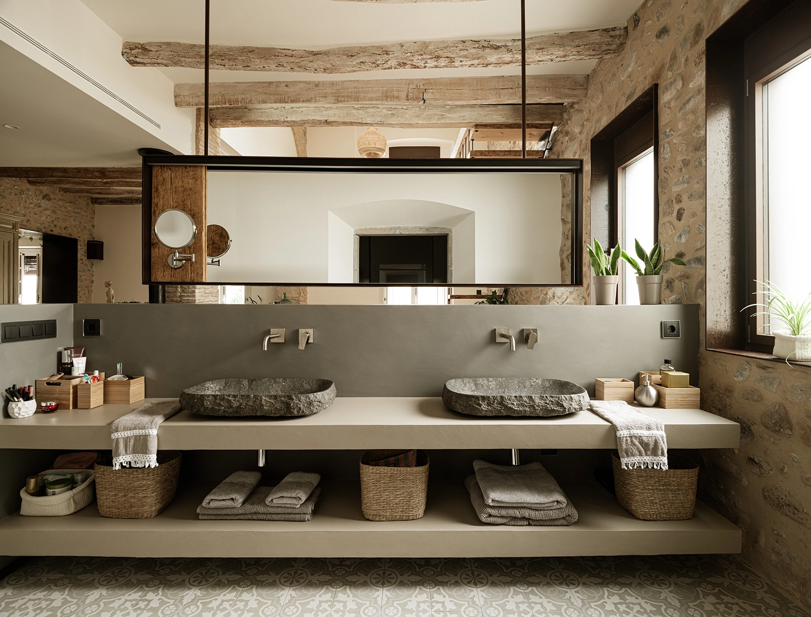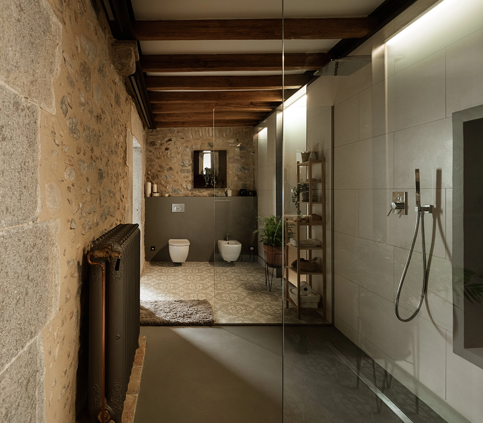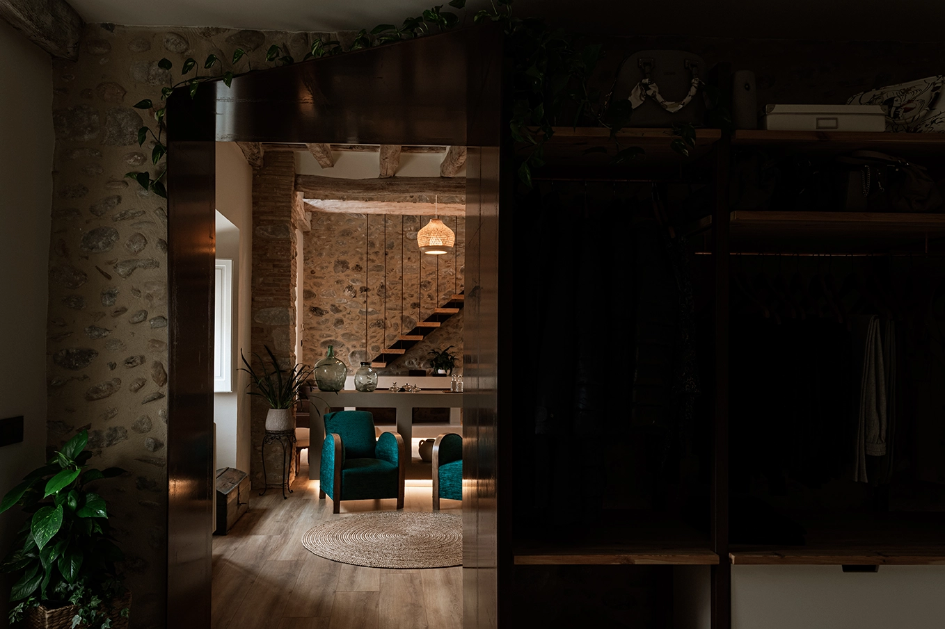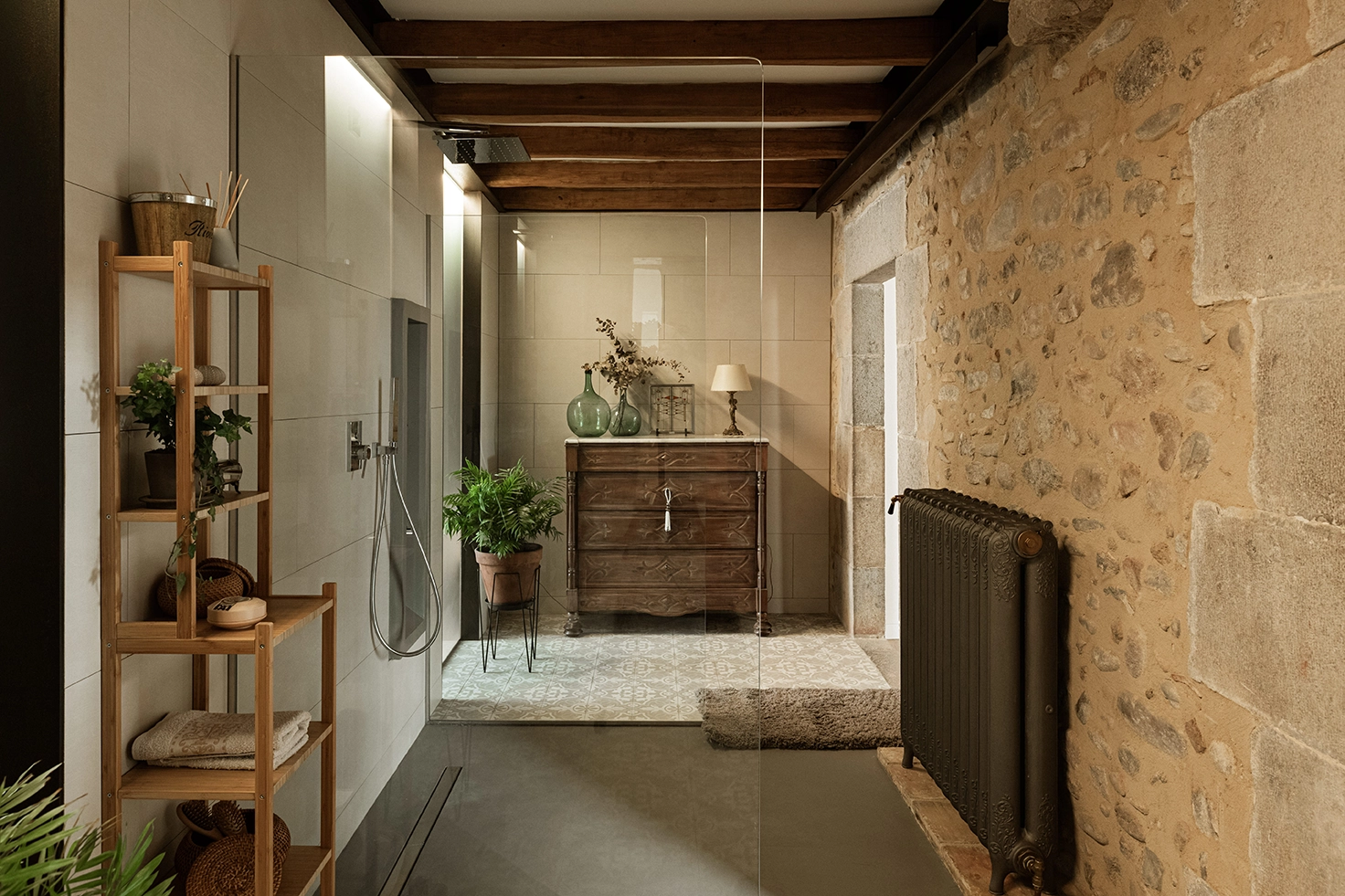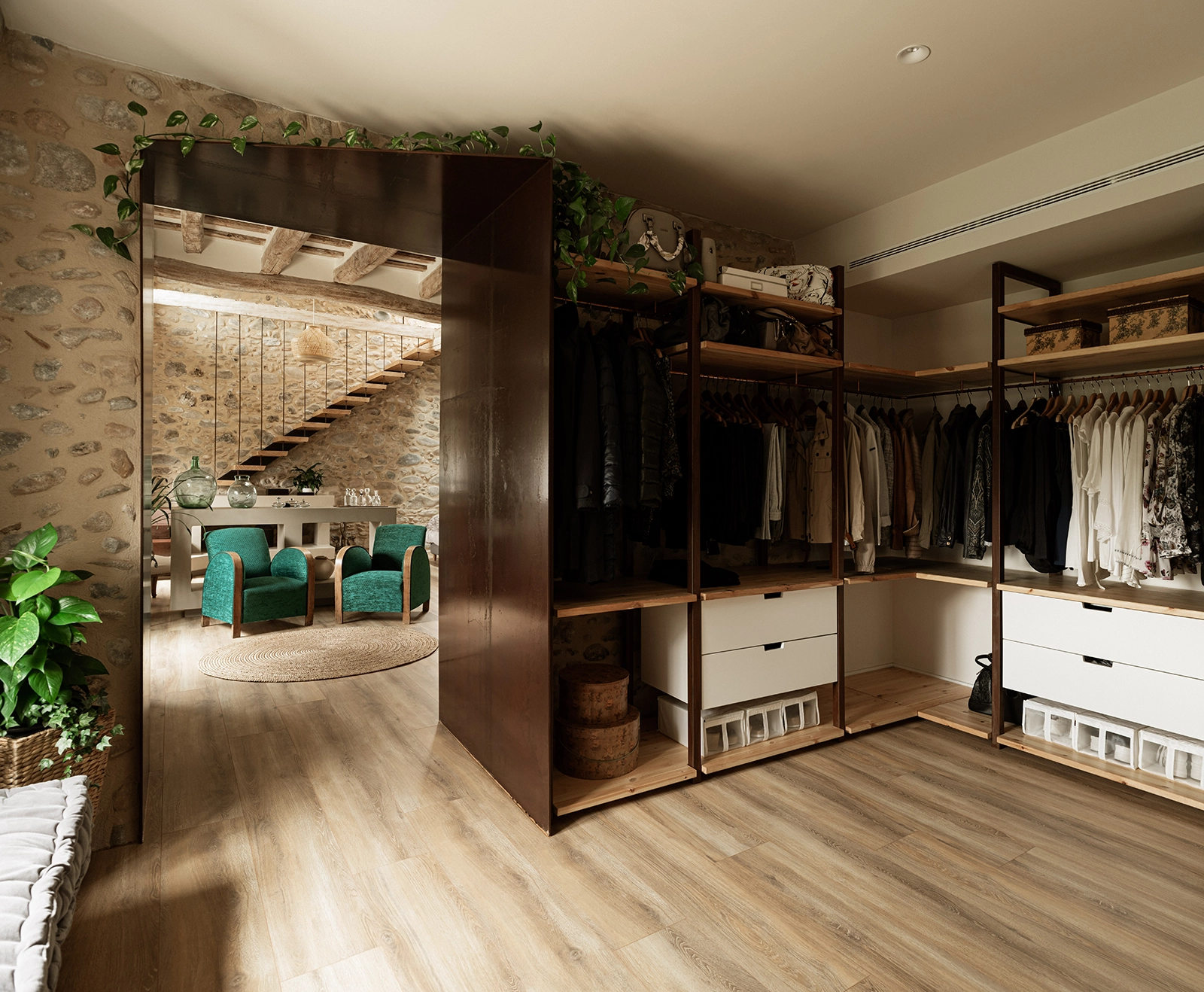El baño se organiza en torno a una gradación entre lo público y lo íntimo: picas de piedra nueva abiertas hacia el dormitorio, mientras ducha e inodoro se ocultan tras un muro de piedra que garantiza privacidad. El pavimento de cerámica hidráulica aporta textura y calidez mediterránea. El vestidor, con mobiliario abierto de madera y metal, combina funcionalidad y estética, conectado a la suite a través de un acceso enmarcado en acero corten que contrasta con los muros de piedra.