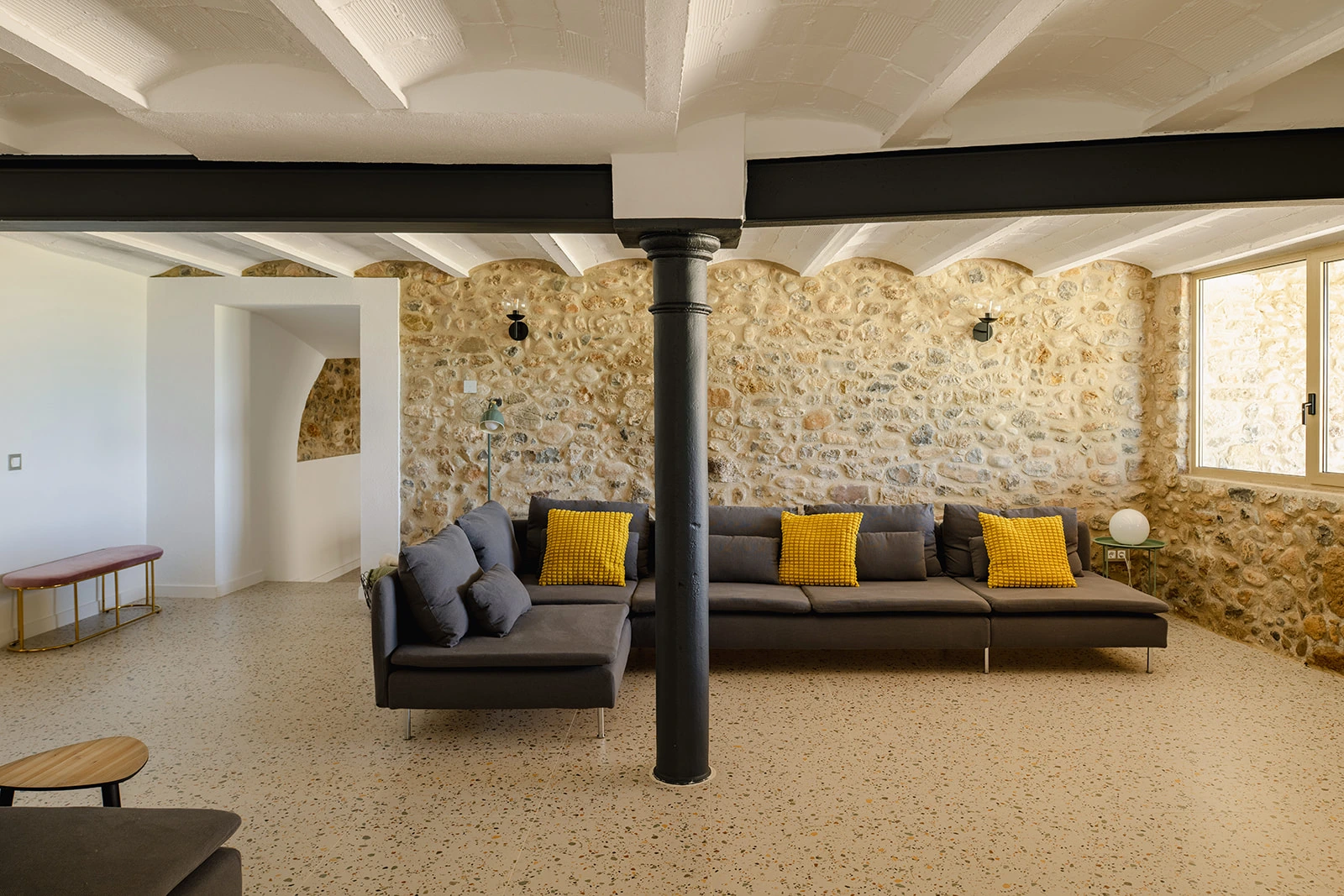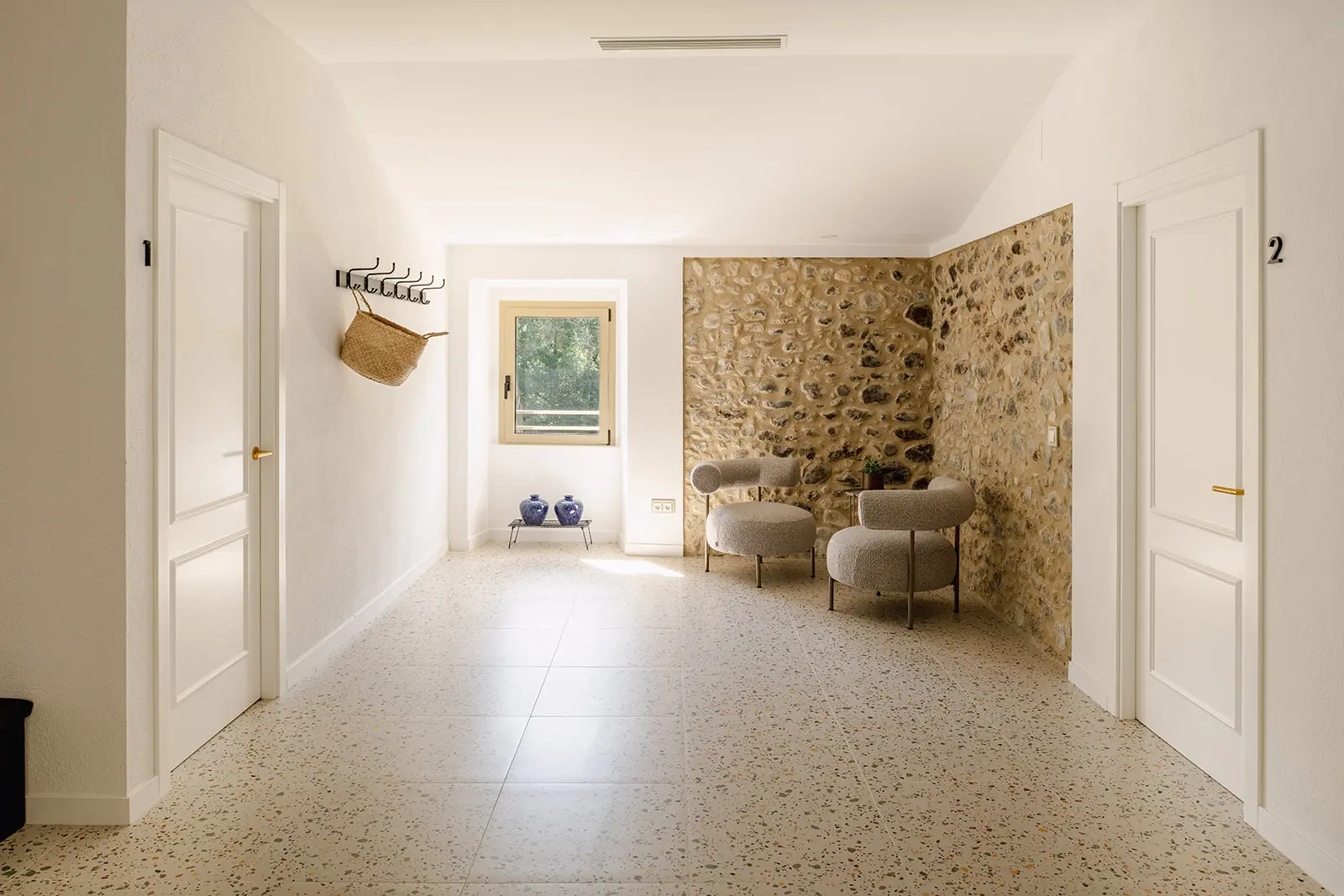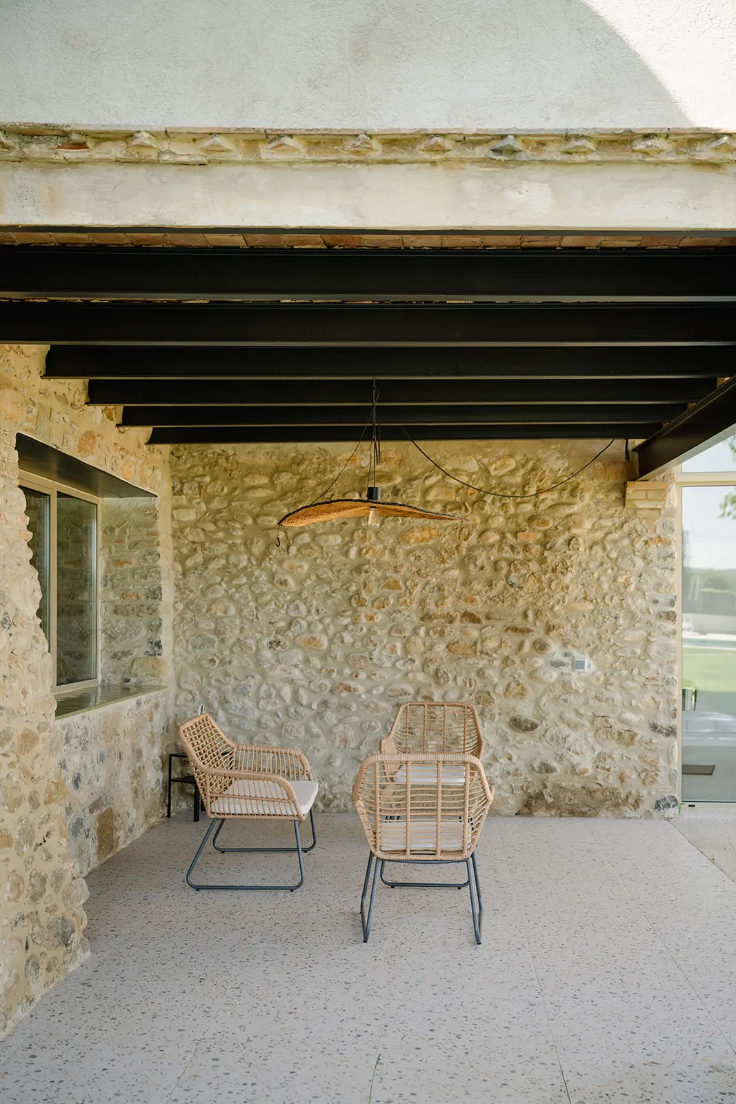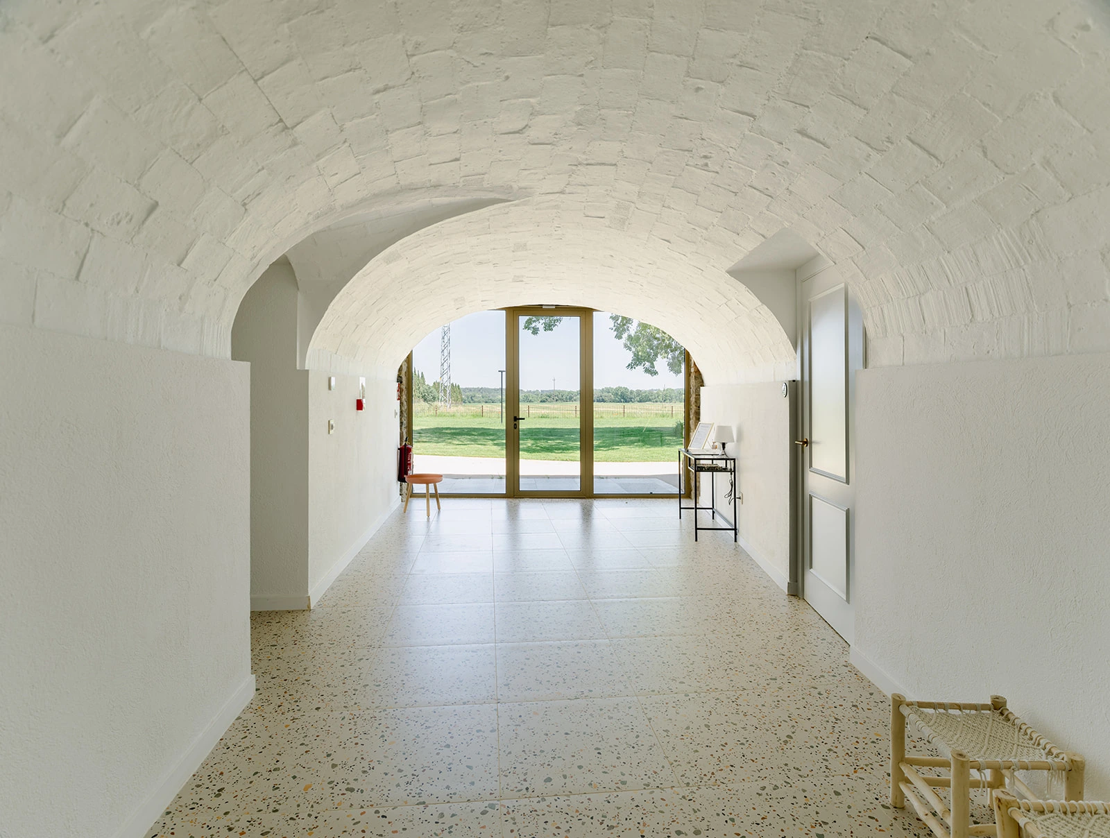 El proyecto apuesta por una rehabilitación respetuosa, donde la arquitectura original marca el ritmo. Los muros de piedra, las bóvedas, los arcos y las estructuras existentes se conservan y se ponen en valor. En el interior, los espacios se reorganizan para ganar amplitud, luz y funcionalidad, manteniendo siempre la lectura clara de la masía original.