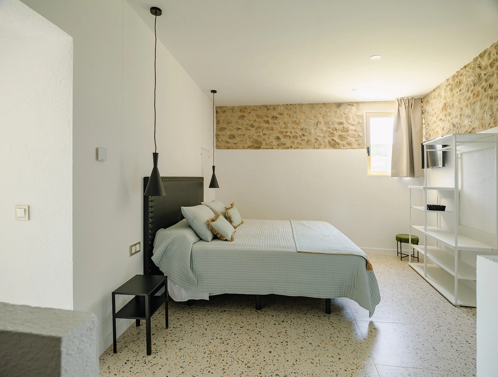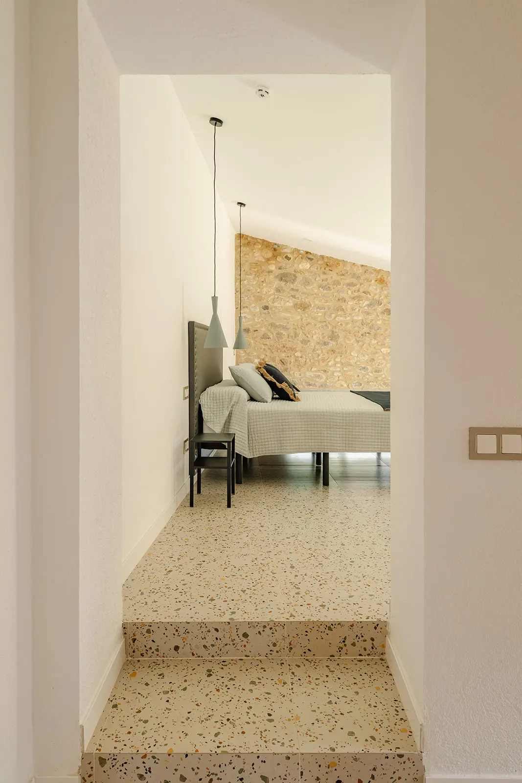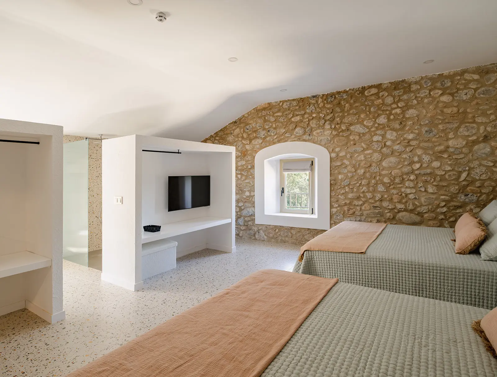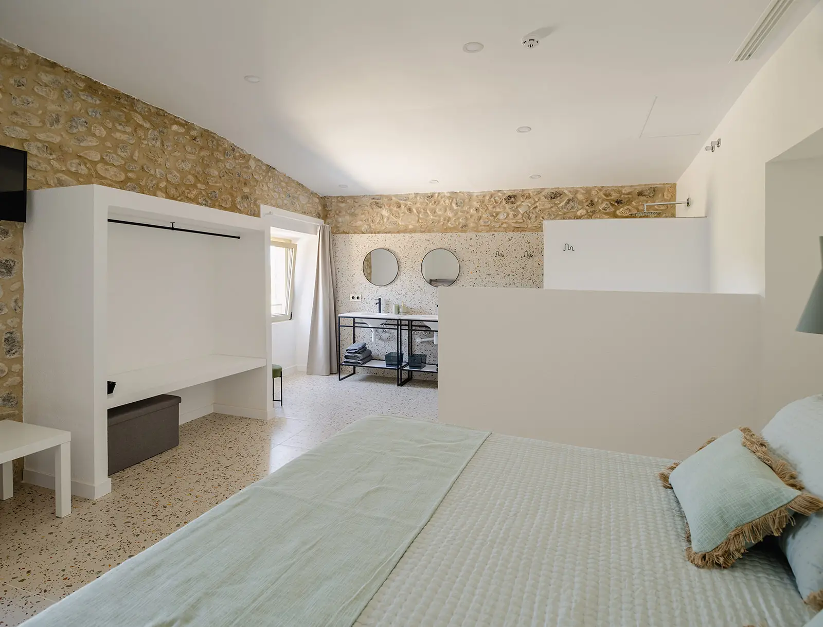 Las zonas comunes se conciben como espacios amplios y fluidos, pensados para la vida compartida y el encuentro, mientras que las habitaciones ofrecen ambientes tranquilos y luminosos, donde la arquitectura original aporta identidad y calma. Los baños, integrados con sensibilidad, combinan funcionalidad y materialidad contemporánea sin romper el equilibrio del conjunto.