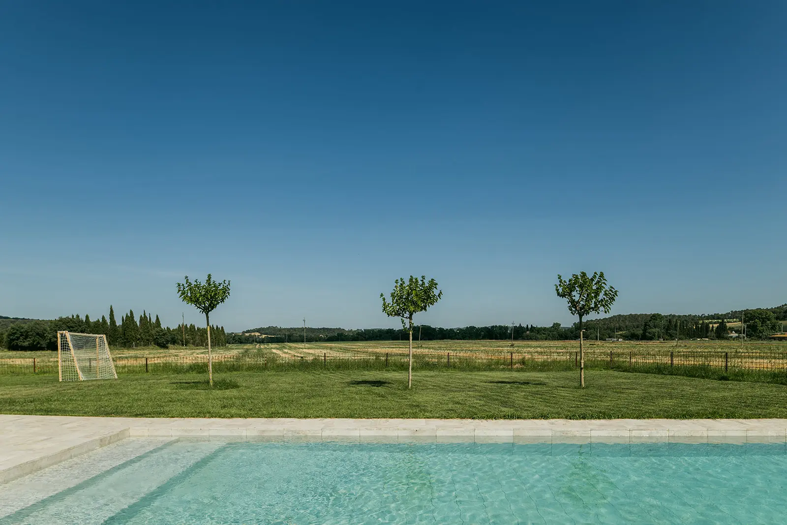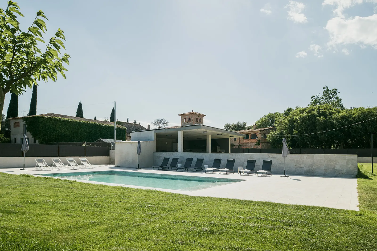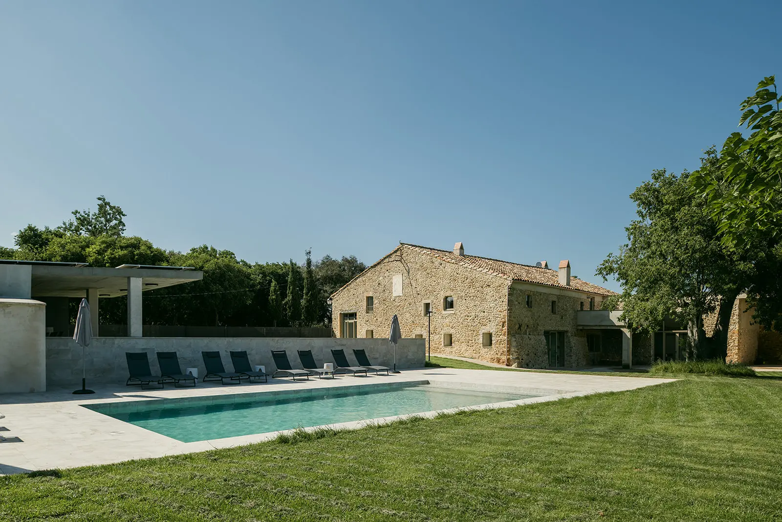 En el exterior, la masía se abre al paisaje de forma natural. La relación entre el edificio, el jardín y la piscina se resuelve con discreción, entendiendo los espacios exteriores como una prolongación del uso interior y como parte esencial de la experiencia del lugar.