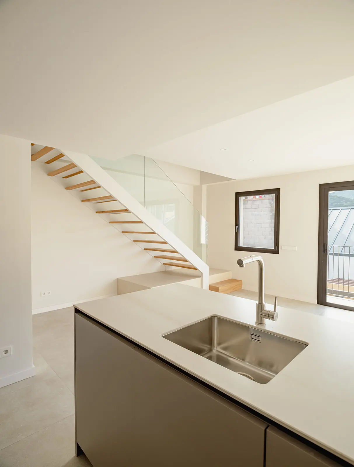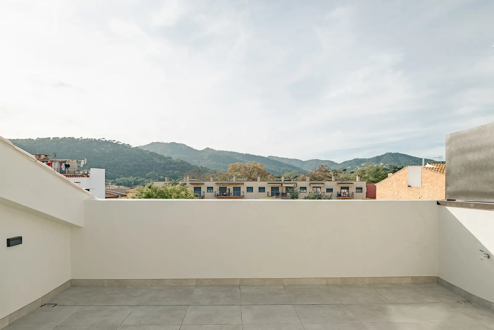Los áticos se resuelven como dúplex, aportando mayor amplitud y riqueza en la organización interior, mientras que las plantas bajas disfrutan de grandes terrazas que amplían la vivienda hacia fuera y adquieren un papel protagonista durante los meses de verano. Las vistas abiertas a las montañas completan un conjunto residencial pensado para aprovechar al máximo la luz natural, la orientación y el entorno.